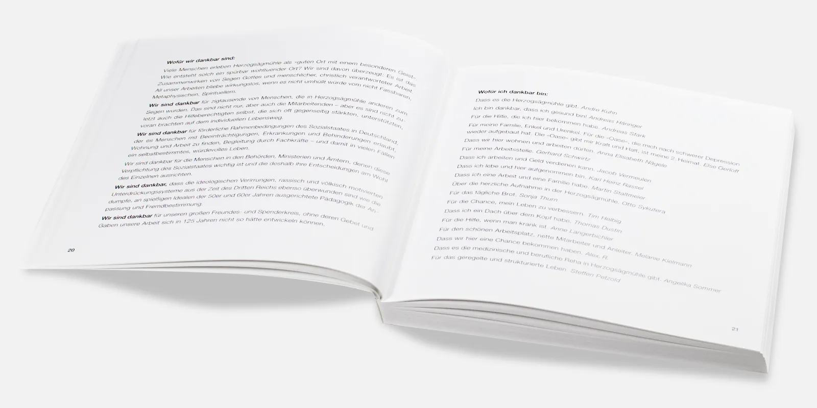 Das Diakoniedorf Herzogsägmühle ist Teil des Sozialunternehmens Diakonie München und Oberbayern und nennt sich selbst »Ort zum Leben«. Zum großen Jubiläum lagen Gestaltung und Umsetzung dieser Festschrift in meinen Händen.